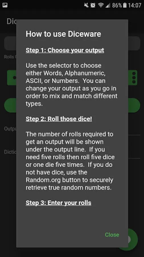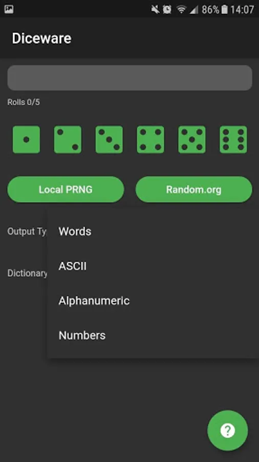 Don't have dice? Use the Local PRNG button to generate pseudorandom numbers or hit the Random.org button to use true random numbers generated by atmospheric noise. This feature is the reason the app needs internet access.