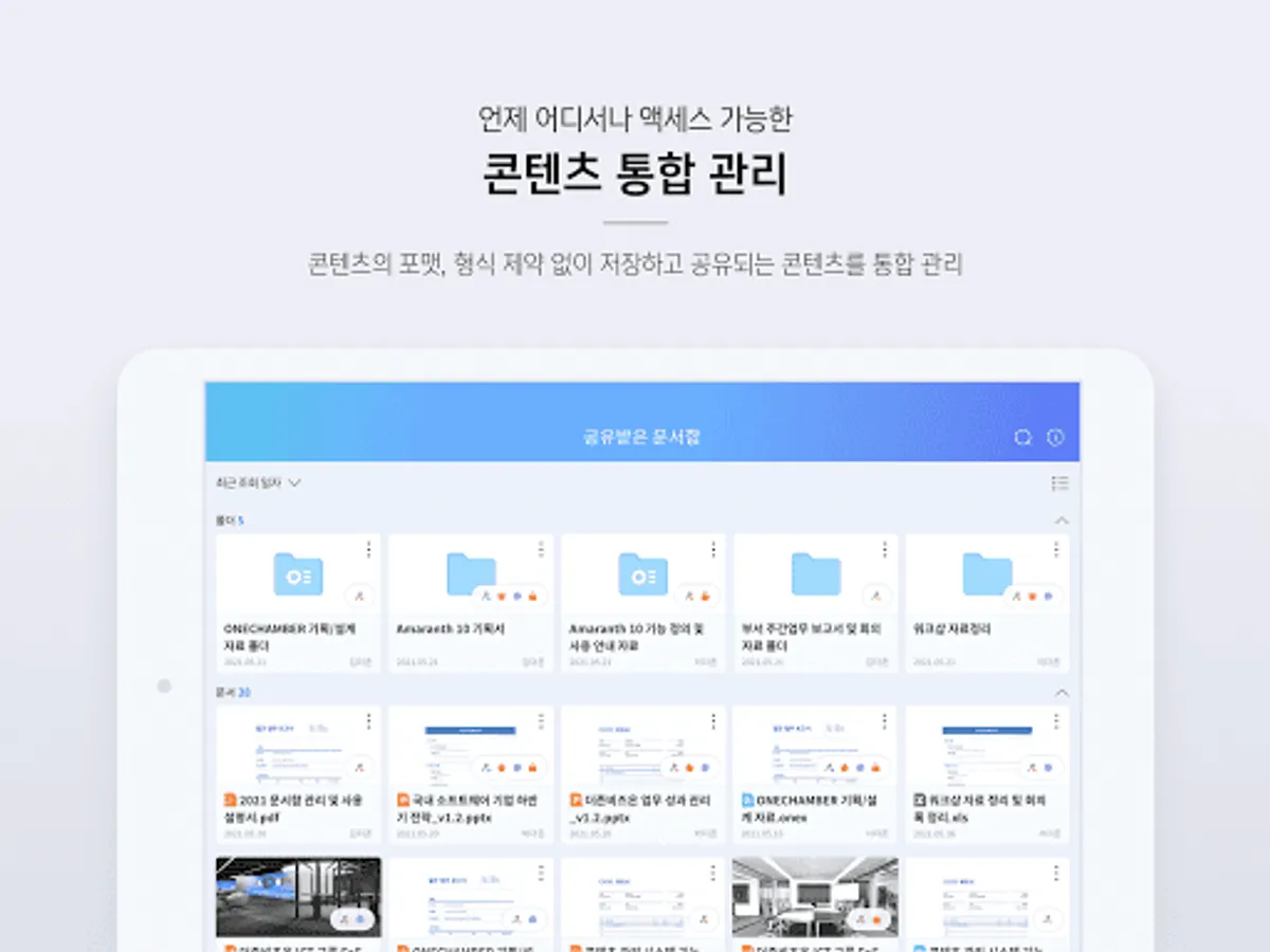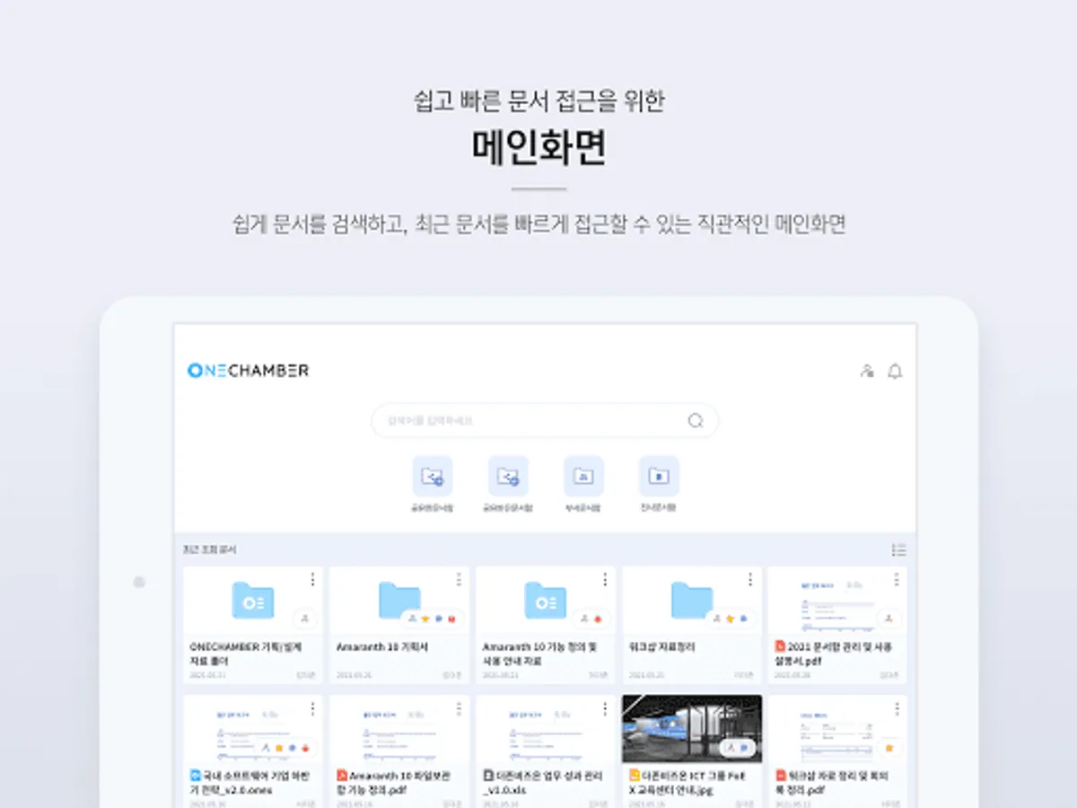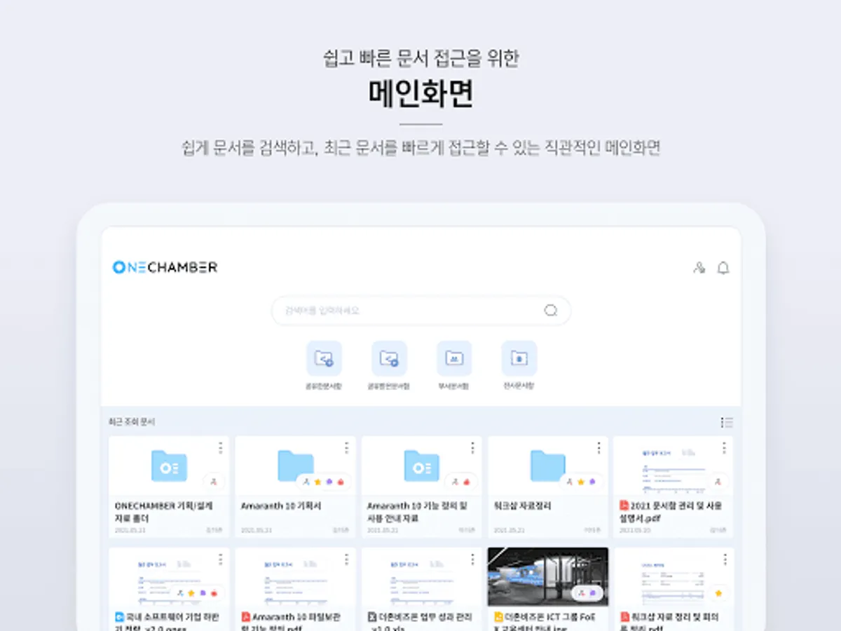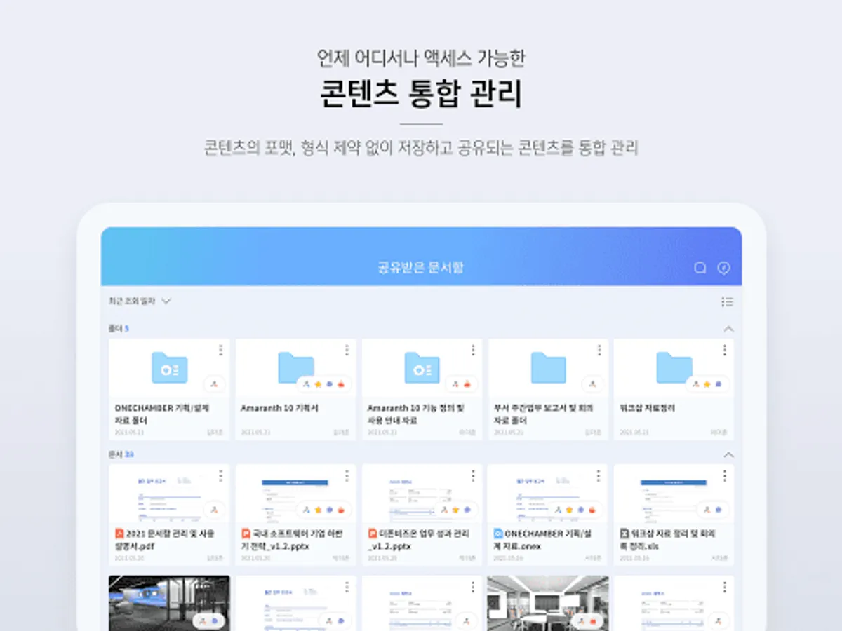 ONECHAMBER safely and systematically integrates and manages all types of content that occurs during work, such as document assetization, collaboration, and access permission setting.