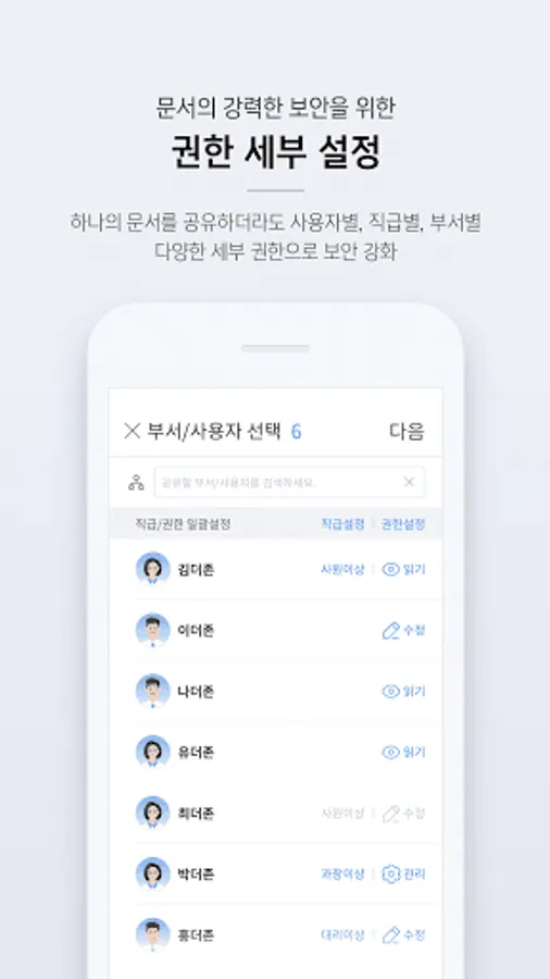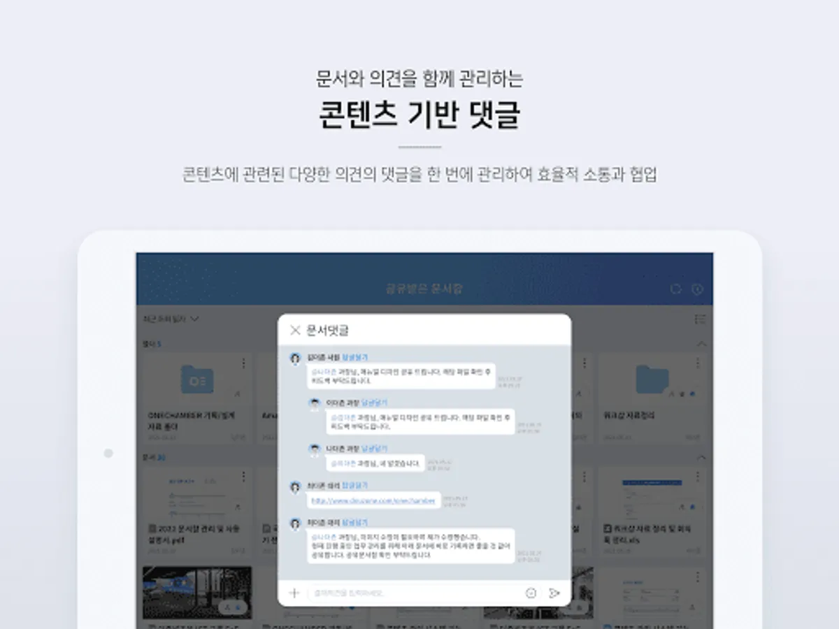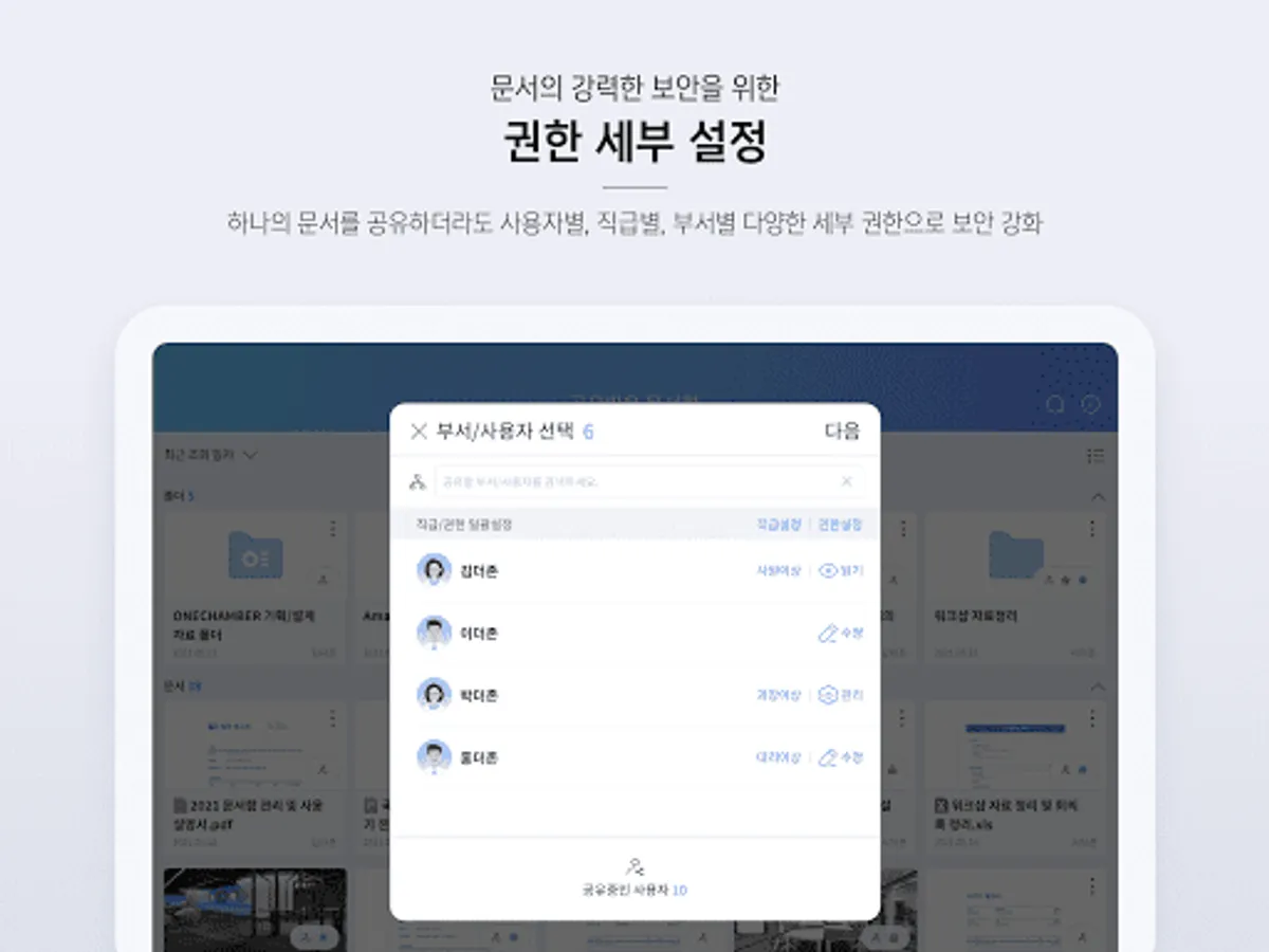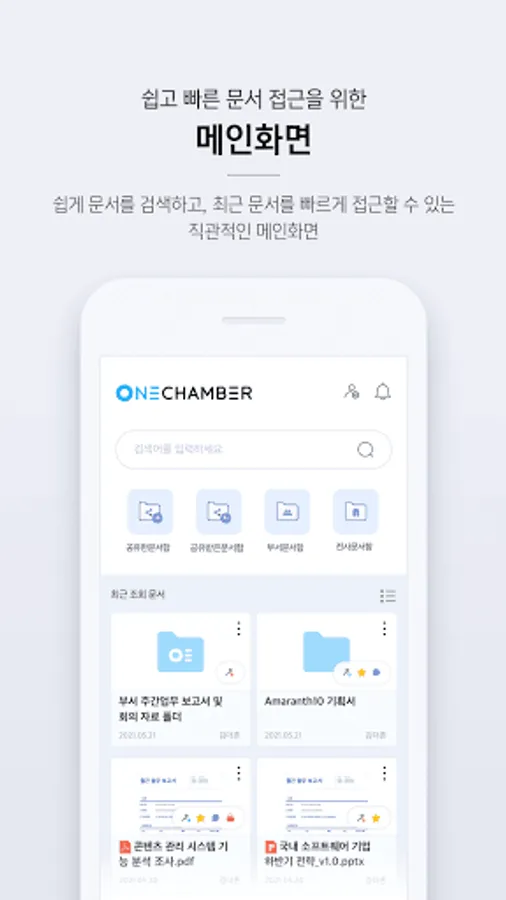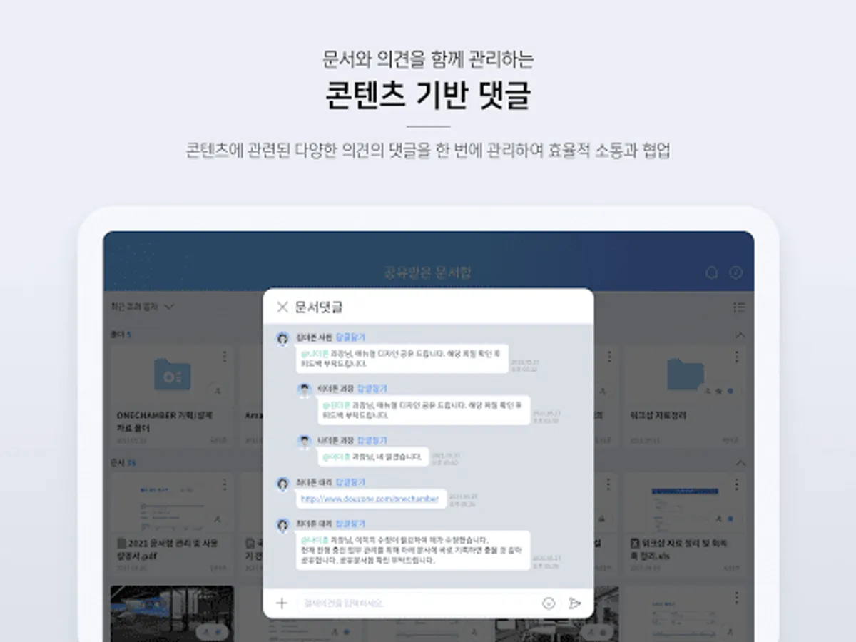 ONECHAMBER safely and systematically integrates and manages all types of content that occurs during work, such as document assetization, collaboration, and access permission setting.