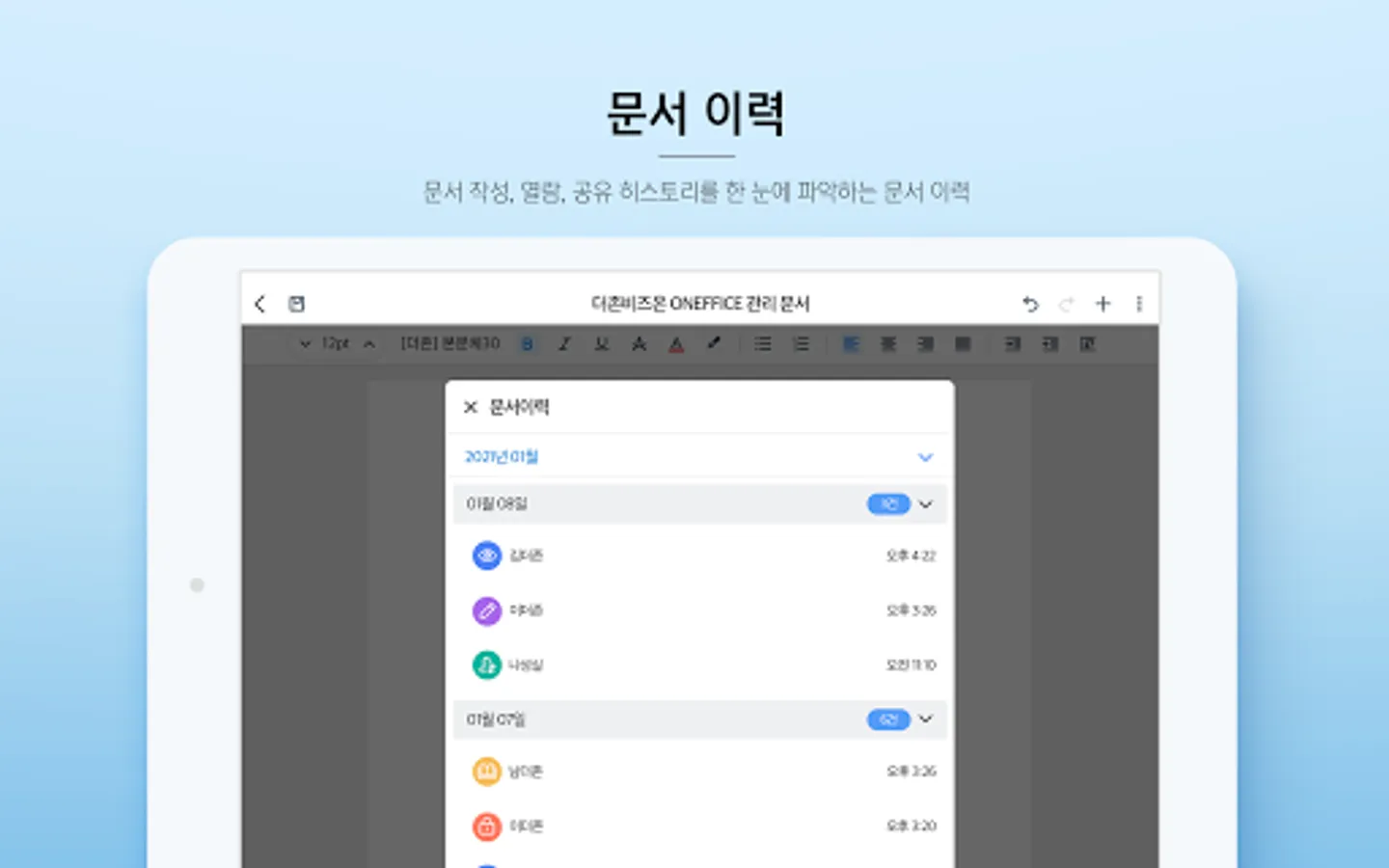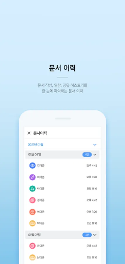 - You can check the document history such as creating, viewing, editing, and sharing documents.