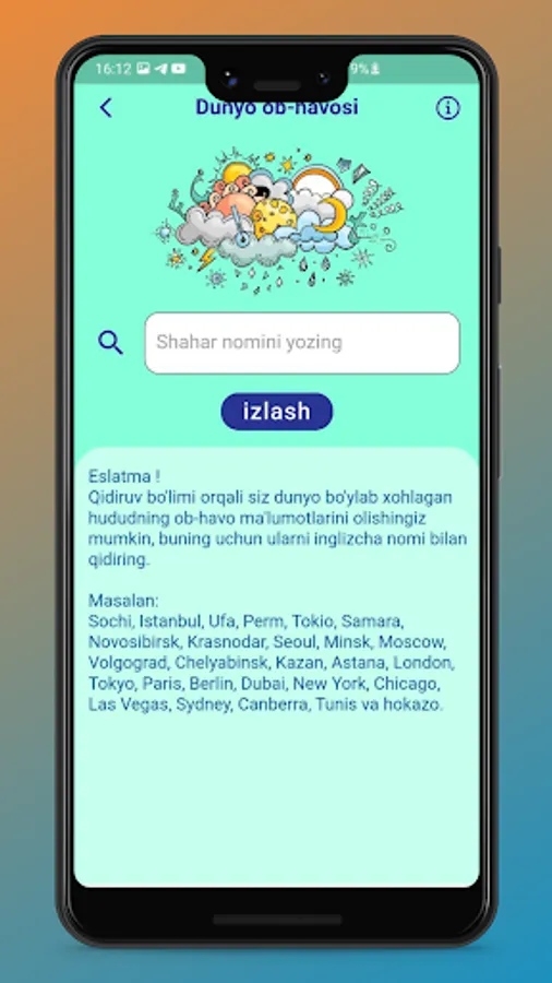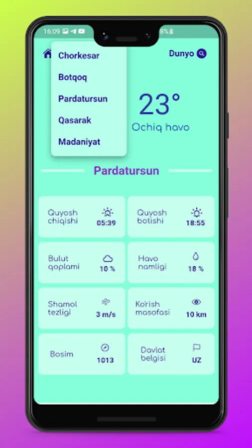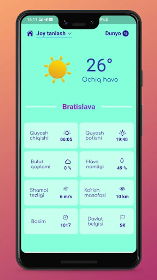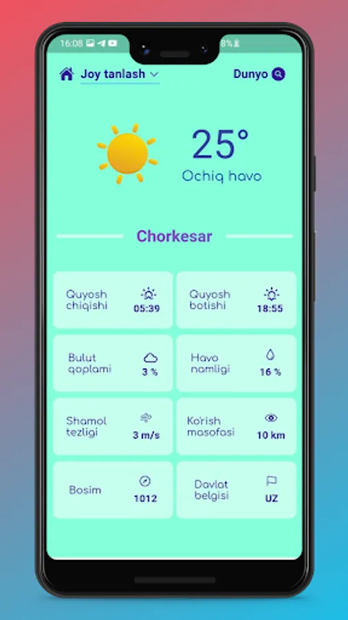Through this application, you can get weather information about Chorkesar and any city around the world. This is the first version of the application, which only shows the current location temperature, precipitation, fog, sunrise and sunset, wind speed, cloud cover, visibility, pressure and so on. A new version will be released depending on how many people use it. In the coming version you will be able to get hourly, daily, weekly and monthly weather information.