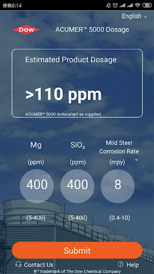 The ACUMER™ 5000 app enables one to estimate the initial dosage of ACUMER™ 5000 to be added to a cooling water system. Using the concentration of magnesium, silica and the annual corrosion rate of the system, the app makes it easy to translate your specific field conditions into the optimal amount of polymer to add to minimize scale formation while reducing product waste. ACUMER™ 5000 is a proprietary multifunctional polymer with a molecular weight of 5000 that provides exceptional silica and magnesium silicate scale inhibition. ACUMER™ 5000 helps prevent silica-based scale formation by minimizing magnesium silicate scale formation at heat transfer surfaces.