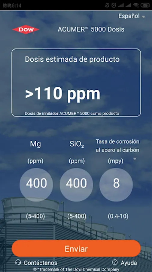 La aplicación móvil ACUMER ™ 5000 permite estimar la dosis inicial de ACUMER™ 5000 que debe ser añadida al sistema de agua de refrigeración. La aplicación utiliza la concentración de magnesio, sílice y la tasa de corrosión anual para obtener de forma fácil y rápida la cantidad óptima de polímero para minimizar la formación de incrustaciones y evitar desperdicio de producto. ACUMERTM 5000 es un polímero multifuncional con un peso molecular de 5000 que provee una inhibición excepcional a la formación de incrustaciones de sílice y silicato de magnesio. ACUMERTM 5000 ayuda a prevenir la formación de incrustaciones de componentes de silicio minimizando la generación de incrustaciones de silicato de magnesio en superficies donde se presenta transferencia de calor.