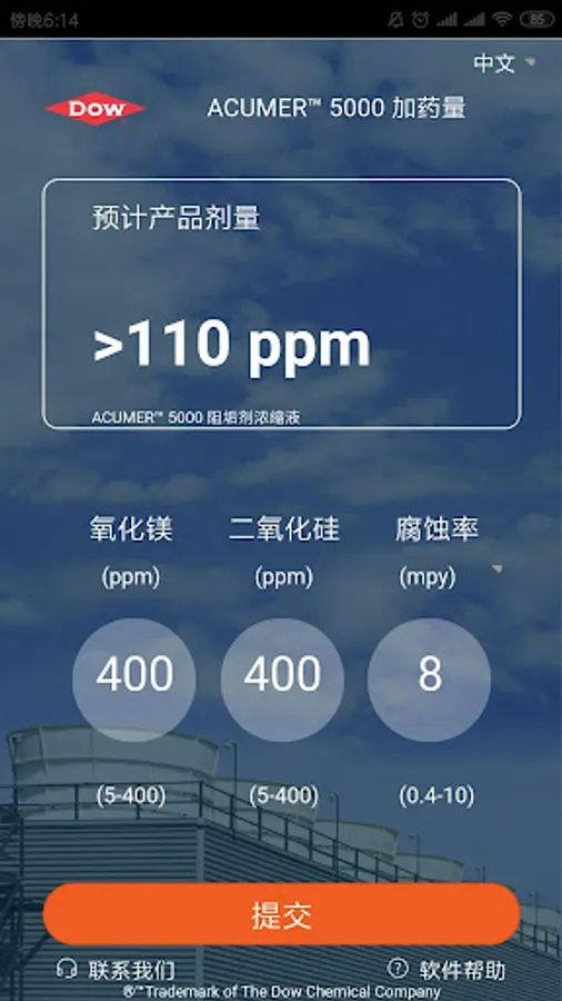 ACUMER™ 5000 应用程序是用于对冷却系统所需ACUMER™ 5000聚合物初始剂量提供估算的应用软件。该应用程序根据冷却系统所含氧化镁和二氧化硅浓度以及年度腐蚀速率,能方便地提供减少水垢所需最佳聚合物用量,同时降低不必要的化学药剂浪费。ACUMER™ 5000是具有分子量为5000的多功能聚合物并对二氧化硅和硅酸镁起到高效阻垢的专有产品。ACUMER™ 5000通过阻止硅酸镁在换热表面的结垢来达到有效的防止氧化硅类水垢的形成。