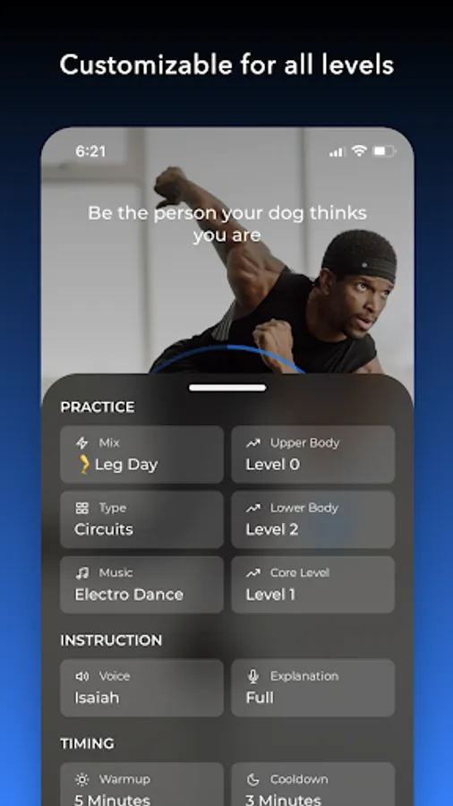 Choose from 4 different levels of Upper Body, Lower Body, and Core to get exercises that challenge you