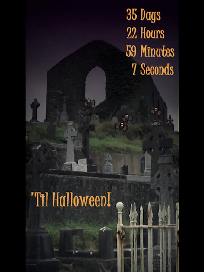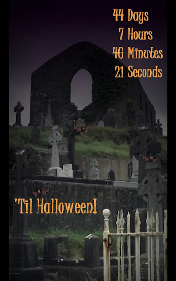 Get ready for Halloween with this spooky countdown app! Provides a festive countdown clock complete with screeching bats, haunting ghosts, and a ghoulish jack-o-lantern. Tap your screen to change between multiple Halloween-themed backgrounds.