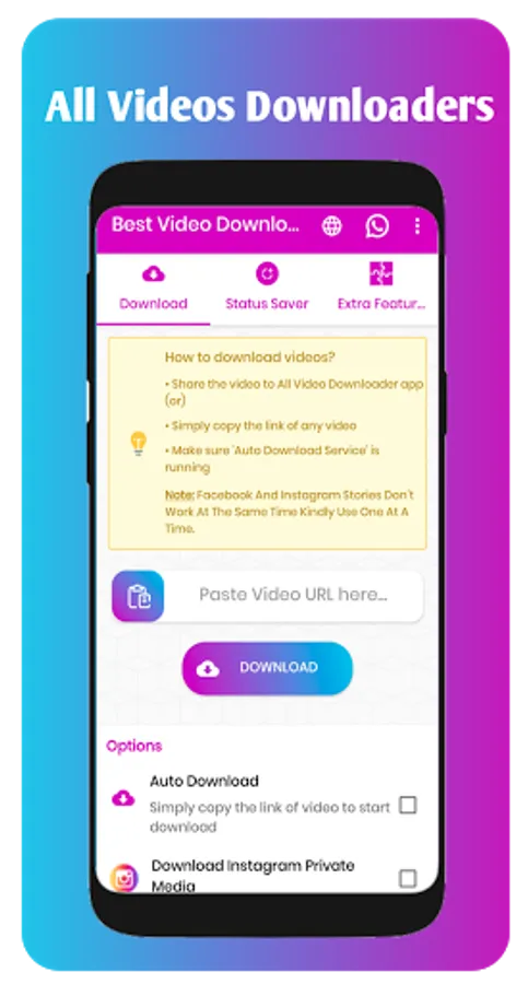 This app has a new feature if you turn on Auto Download feature than you just copy link this app automatically download video and photo.