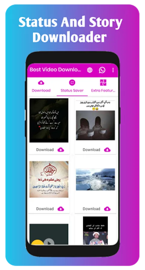 Yes this downloader app has all feature in one APP(Best Downloader), and it is very easy UI design, easy to use and simple to use. In this app you do status saver , Stoires download and website videos download(No Youtube). After Download any file go to app gallery and you watch your download photos and Videos to watch offline easily.