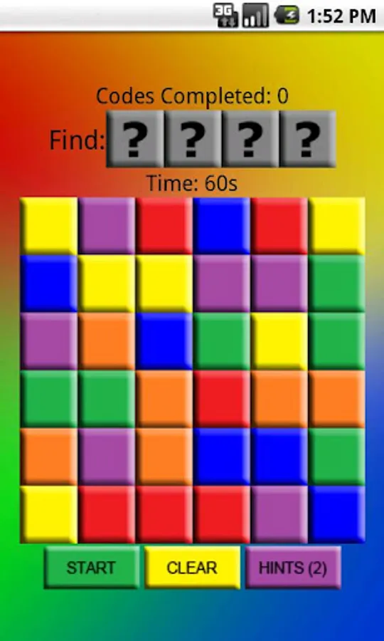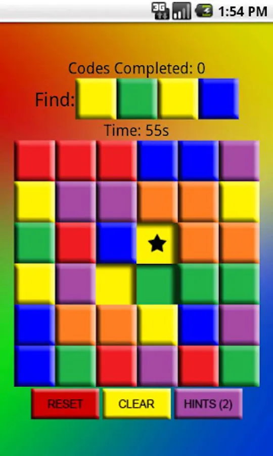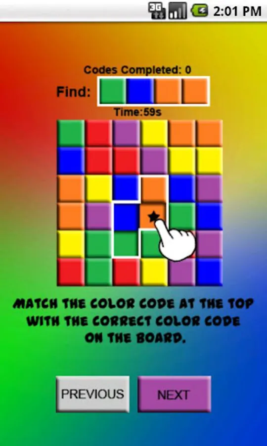 Color Coder is a fun pattern recognition game. When the game starts, a code is shown at the top of the screen. Find the code within the color grid, but remember: codes can only chain to cells sharing a side.