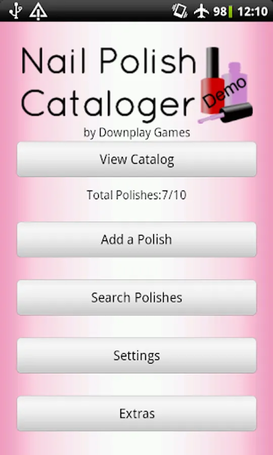 The Nail Polish Cataloger is a personal database (stored locally) to keep a record of all the nail polishes in your collection. In this free demo version you are limited to only 10 entries in your catalog. Upgrade to the full version to store a virtually unlimited* number of polishes in your catalog. Polishes can be stored with the following data: