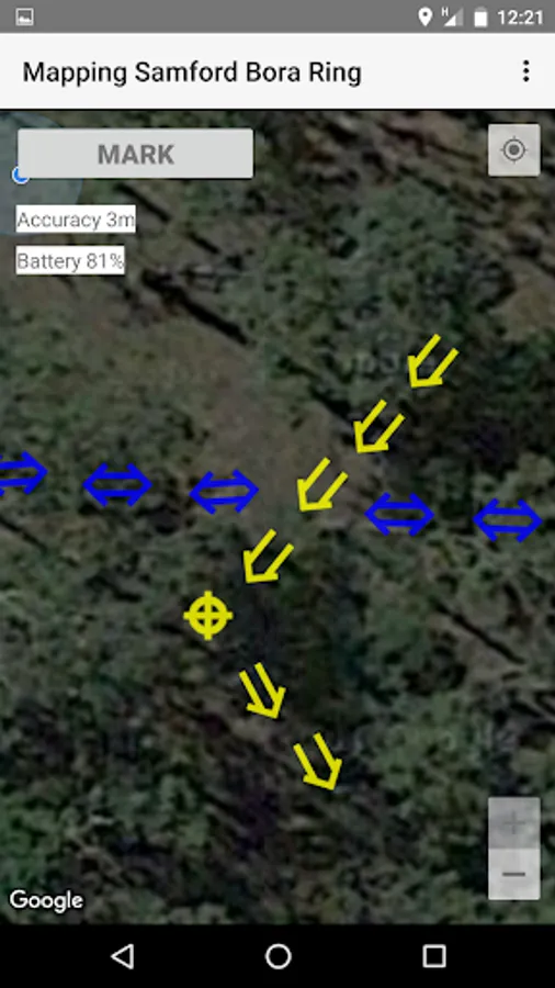 Markers can be moved to the correct position on the map to allow greater accuracy than GPS alone provides. Screen shots show a small partially wooded site. In such locations GPS can struggle. The ability to adjust the markers’ positions allows the mapping to capture the patterns of the lines dowsed in a way that the inaccuracy of raw GPS locations would muddle.