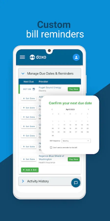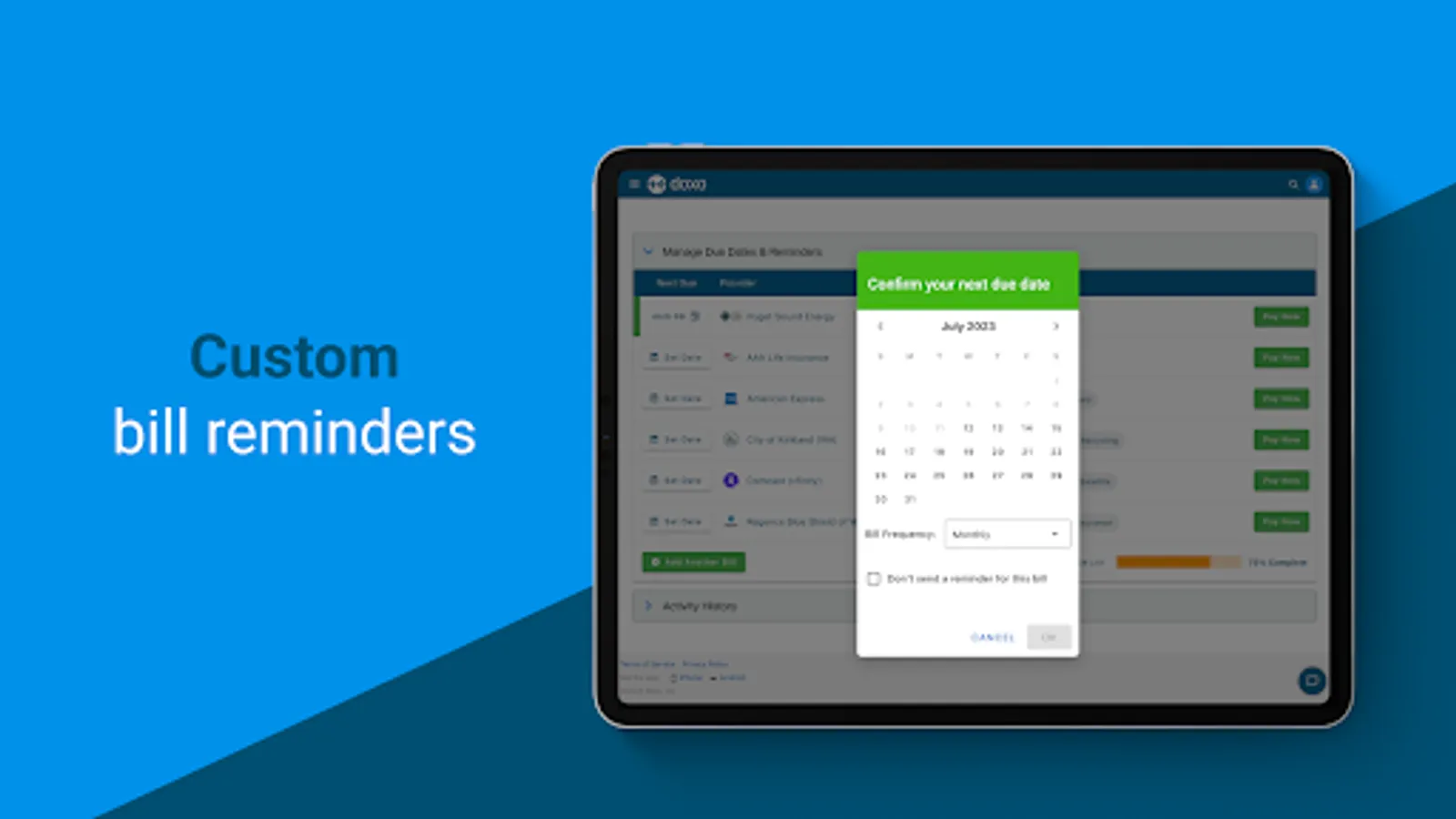 2. Add your household bills. Confirm your due dates to receive free bill-pay reminders for more than 120,000 billers.