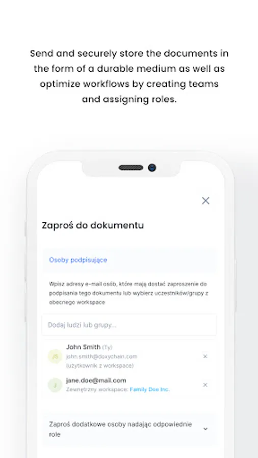 With DoxyChain, you can send and securely store the documents in the form of a durable medium as well as optimize workflows by creating teams and assigning roles. By cooperating on a contract with a B2B / B2C client or your team, you will save time and minimize costs, simultaneously reducing paper consumption.