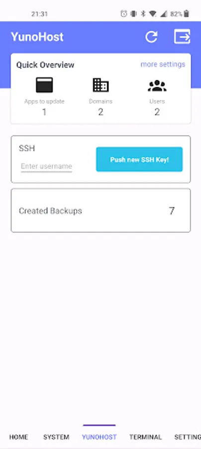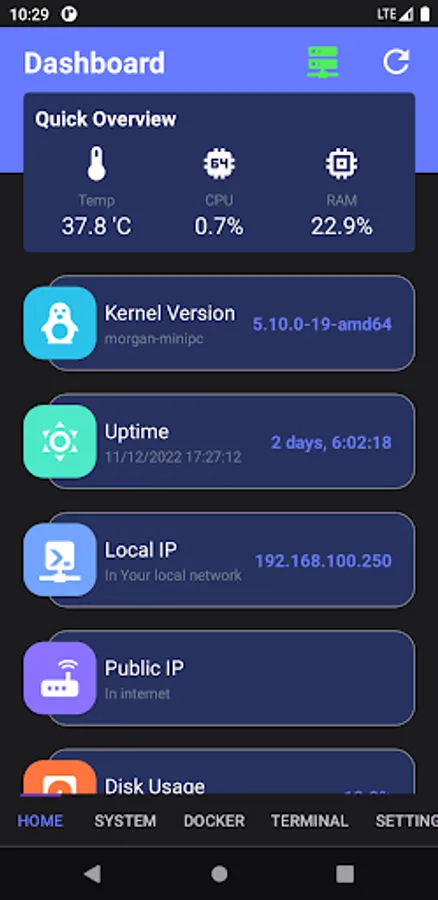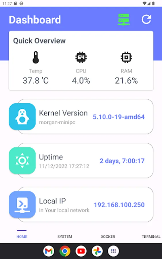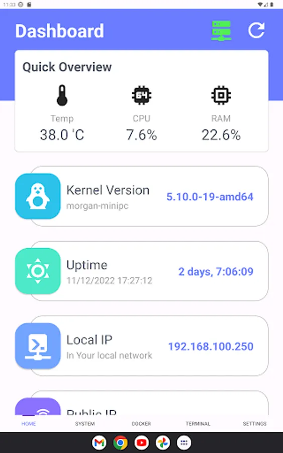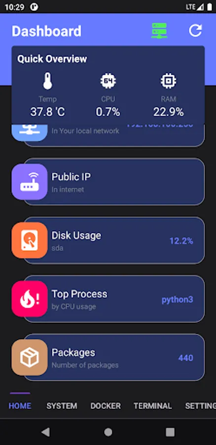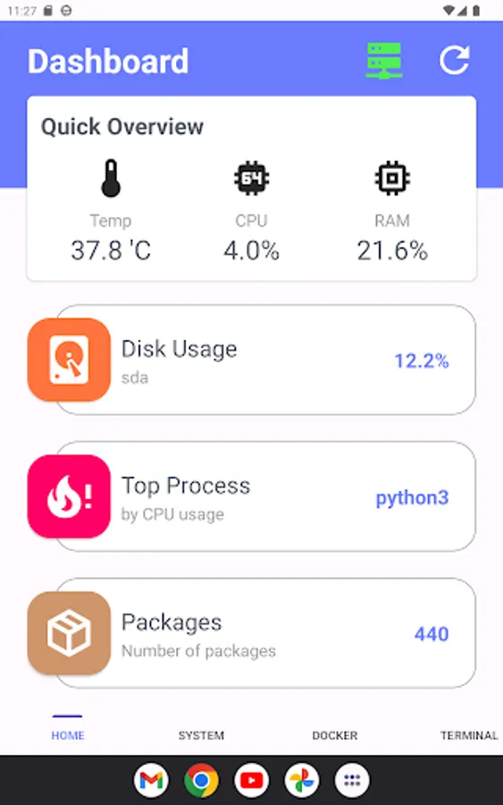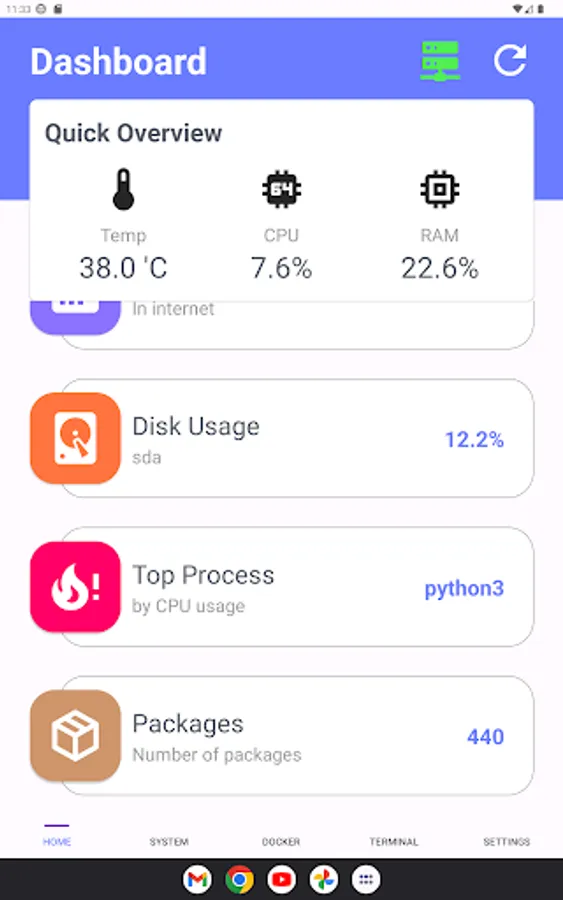 Mobile application that helps manage self-hosted homelab. The mobile client application is a great tool that allows you to manage your server quickly, conveniently, and almost anytime. For now, the application is mainly focused on retrieving information from the server. In the app you can see nicely displayed stats about your server kernel version, server uptime, boot disk usage, currently most demanding process, number of installed packages, and much more. If you are running Docker on your system there are some great options available for you. Listing Docker containers, showing statistics like processor and memory usage, disk or network i/o operations. Starting, stopping, and restarting containers is also ready to use. If you are running Yunohost instead, have no fear, there are also plenty of options available for you! You can check if you have any apps updates, and how many domains or users you have. With one click you can write the SSH key for a specific system user or check how many backups are created. Without system restrictions, auto update of the dashboard is available with a minimum period of 10 seconds and a maximum of 1 minute.