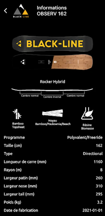 With the Black-Line application you can scan the Black-Line Tag embedded in your ski or snowboard and thus obtain: