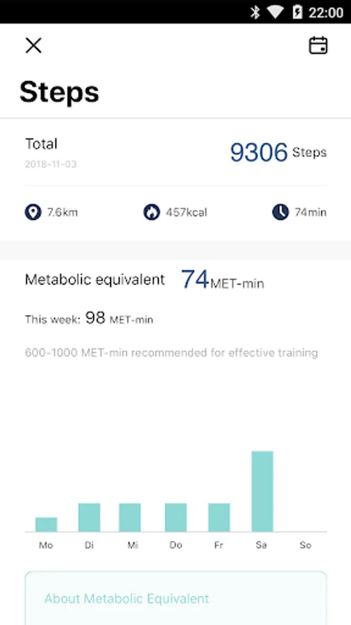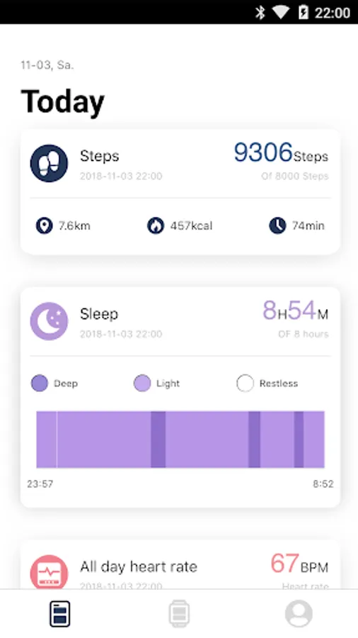 • The Today view gives you a quick overview of your sporting activities, such as steps, distance, calories, daily goal, as well as sleep, heart rate, blood pressure and blood oxygen.