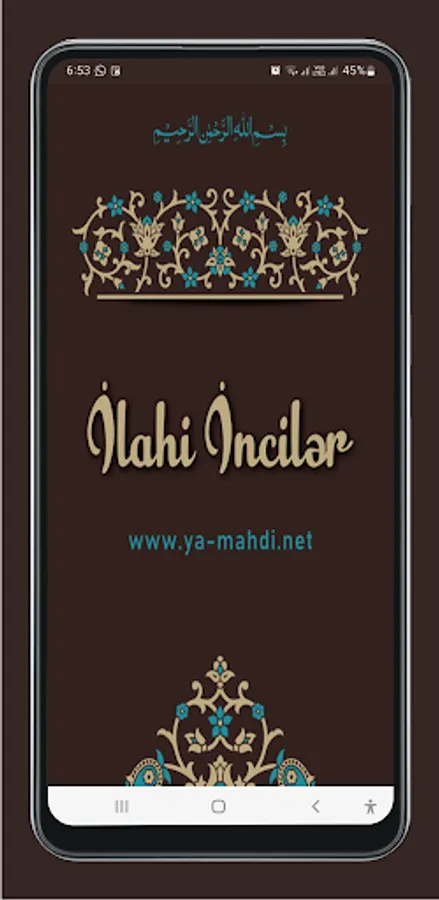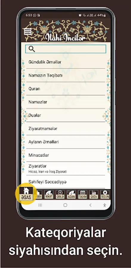 The application contains Holy Quran, Mafatihul Jinan, Sahifeyi Sajjadiyya, Sahifeyi Mahdiyya, prayer times, Hijri calendar, rakat calculator and azan notification.