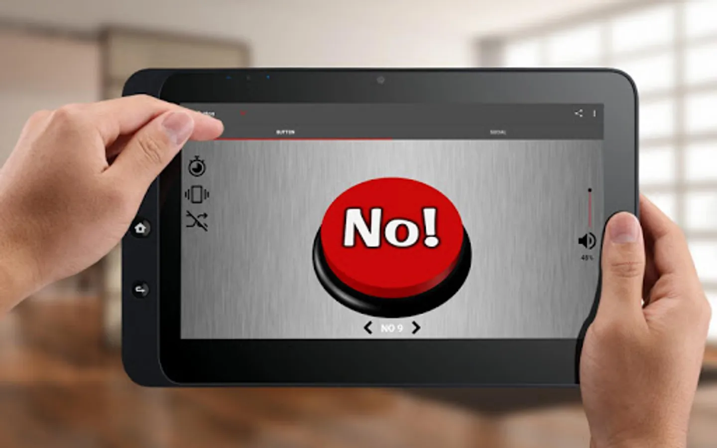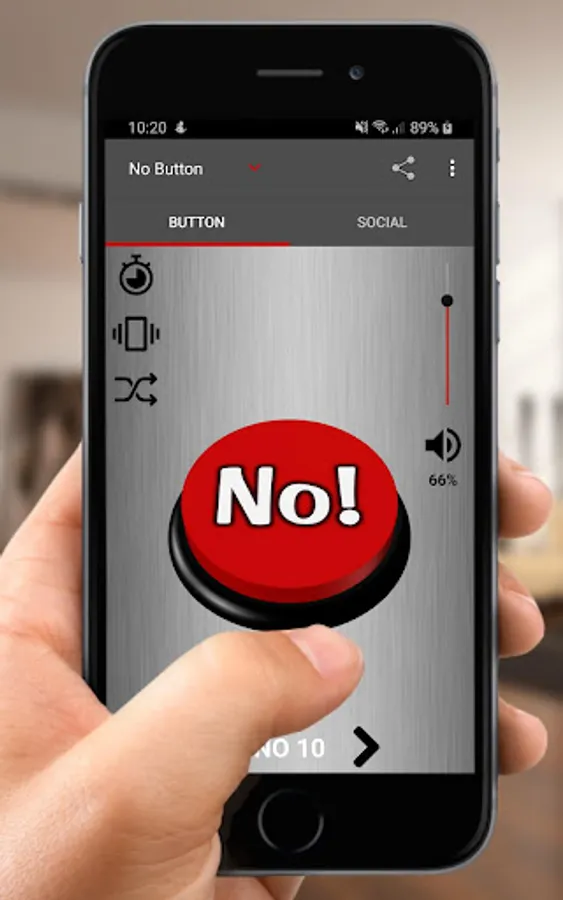If you have a hard time saying "No" or are tired of saying "No" then you need this button. When you press the button instant answer "No" sound effect will be played. You can choose between several "No" sound effects or turn on the shuffle option.