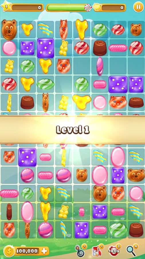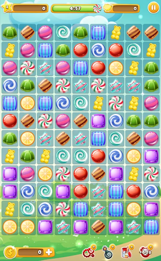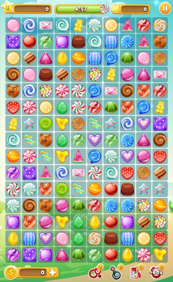 Connect 2 matching candies using three or fewer straight lines to clear candies, clear all candies to go to next level.