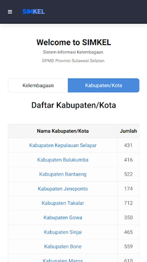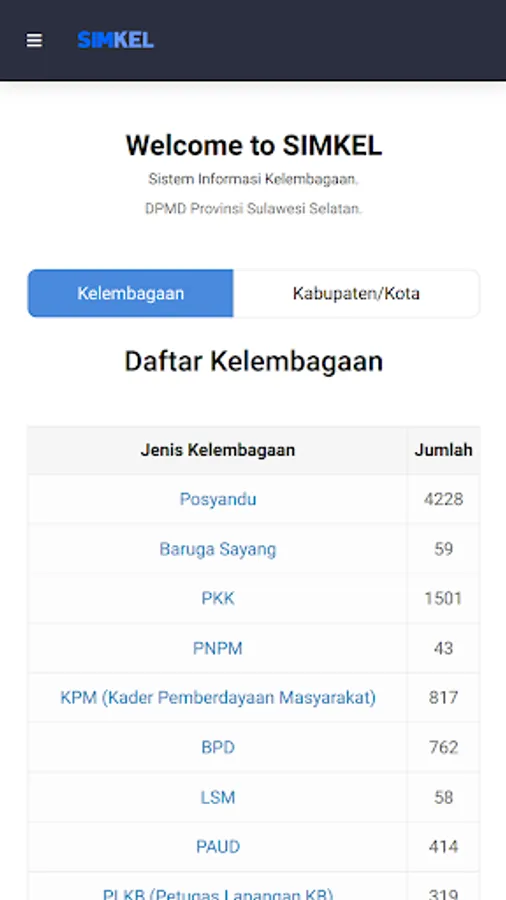 Institutional Information System, contains information on community development in villages, based on sub-districts and city districts in South Sulawesi, which consists of 20 institutional categories such as posyandu, PKK, LPM, Paud, Youth Organization and other institutions, with information on the number of institutions, management and members, the activeness of the institution and some other additional information based on the category of the institution