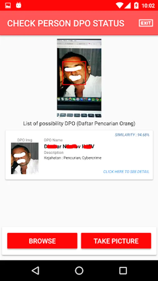Mobile application to check a person status. This application will compare person image to police wanted list / DPO (Daftar Pencarian Orang) from http://www.interpol.go.id/ using Azure Cognitive Services. The app will give notification to user if the inputted image is within the police wanted list / DPO.