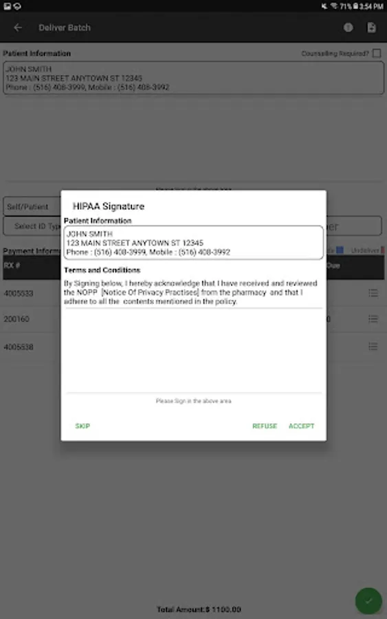 * The patient can sign once for multiple prescriptions and has the ability to uncheck specific scripts if they do not wish to take delivery at that time.