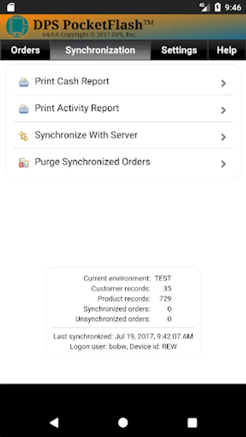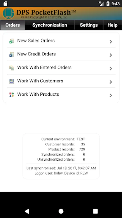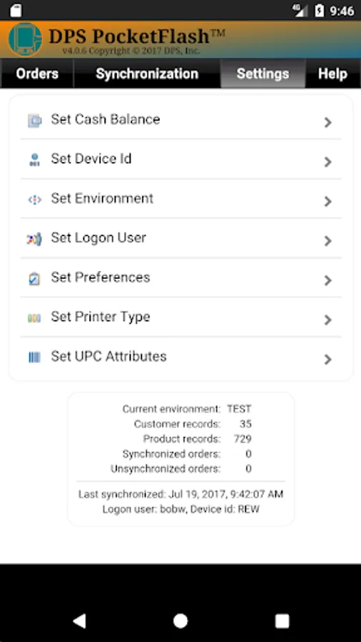 The first time you run the app on your device, you will need to Set Device Id, Set Logon User, Set Environment (Test or Live) and then do a Synchronize With Server.
