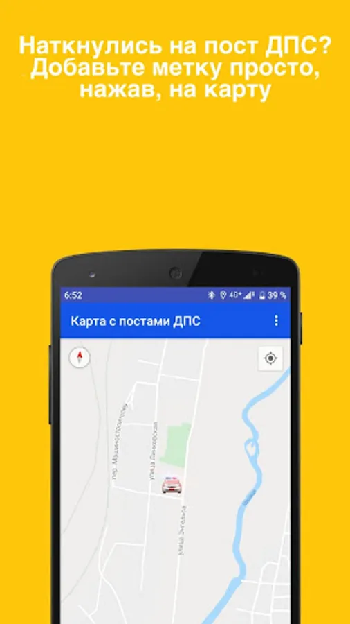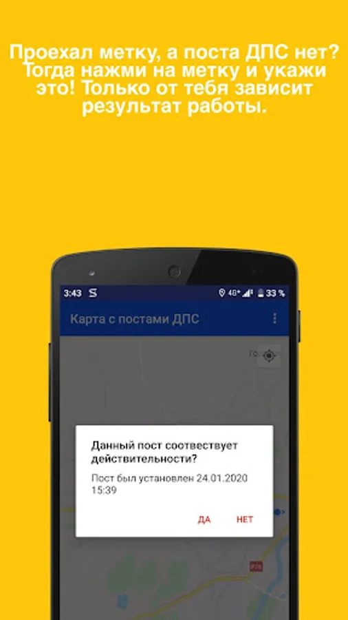 A user who stumbles upon traffic police officers can mark this traffic police post on a map. The remaining users will only have to confirm or deny this information by clicking on the label of this DPS post. Using the information received from users, the application edits the mark of the traffic police post