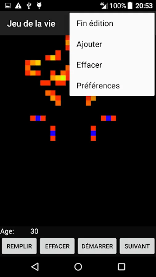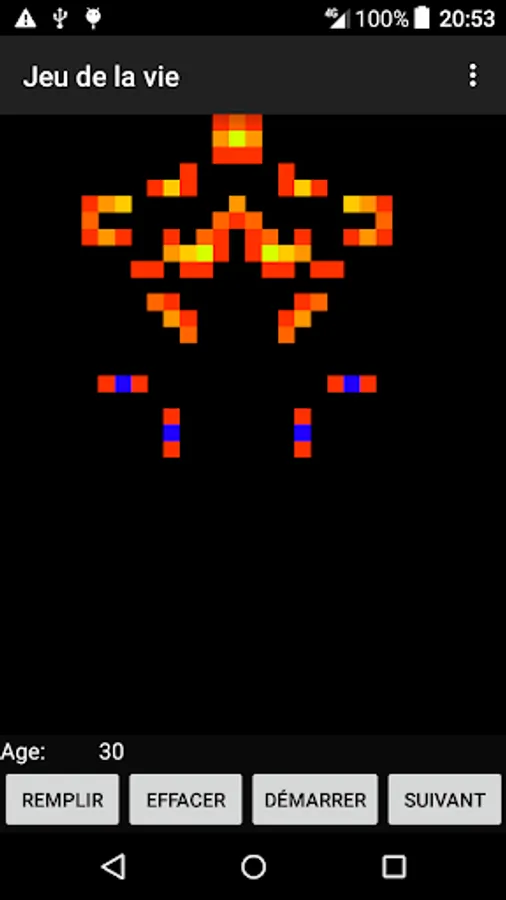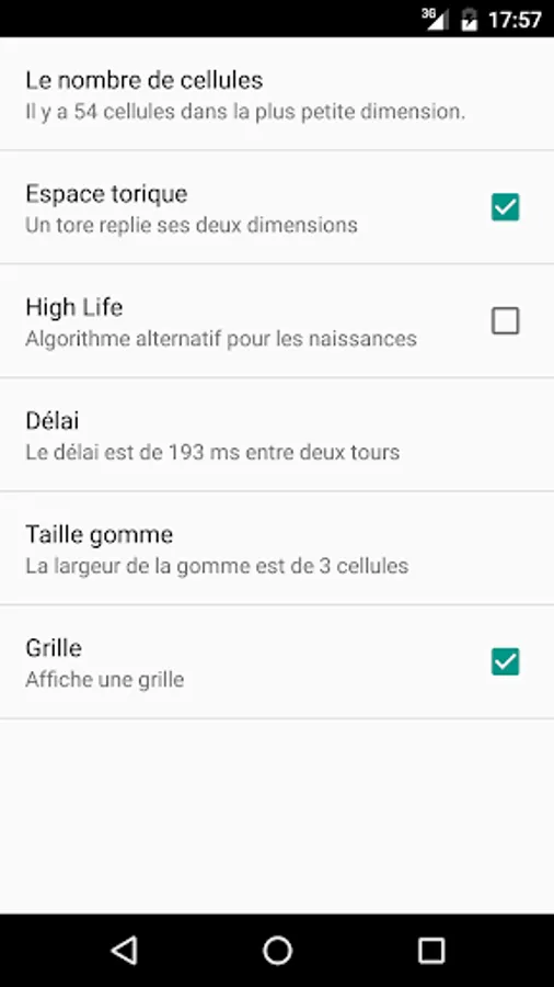 The number of cells, the delay between two turns, the torus space and the "High Life" mode can be changed. A grid can be displayed.