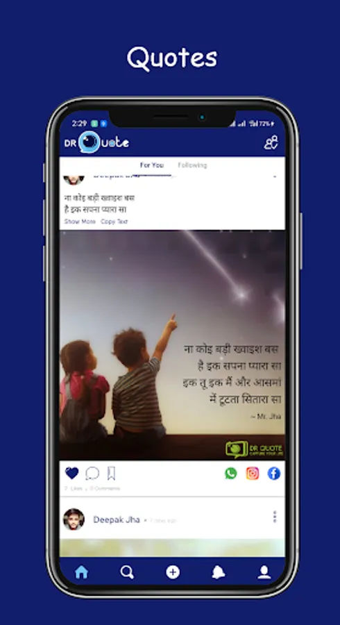 Welcome to DR Quote 'Capture Your Life' Indian App. Write lines with different type of backgrounds, fonts and colours. Easily save as an image and share with friends. Simply Login with Facebook and done. Follow to other users to see their posts. Like comment and share quotes.