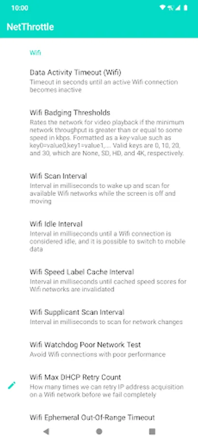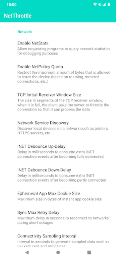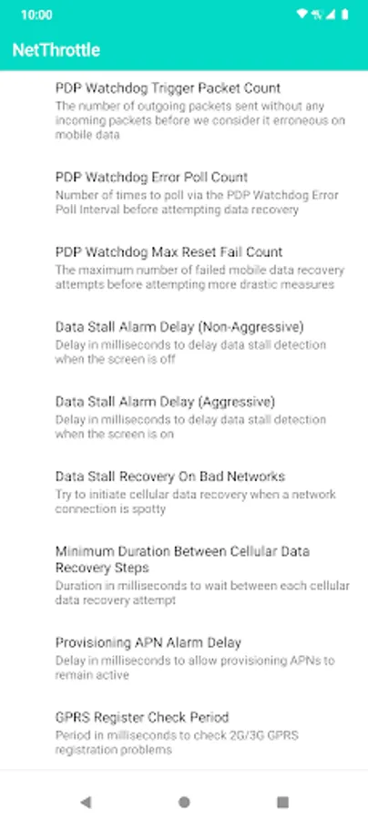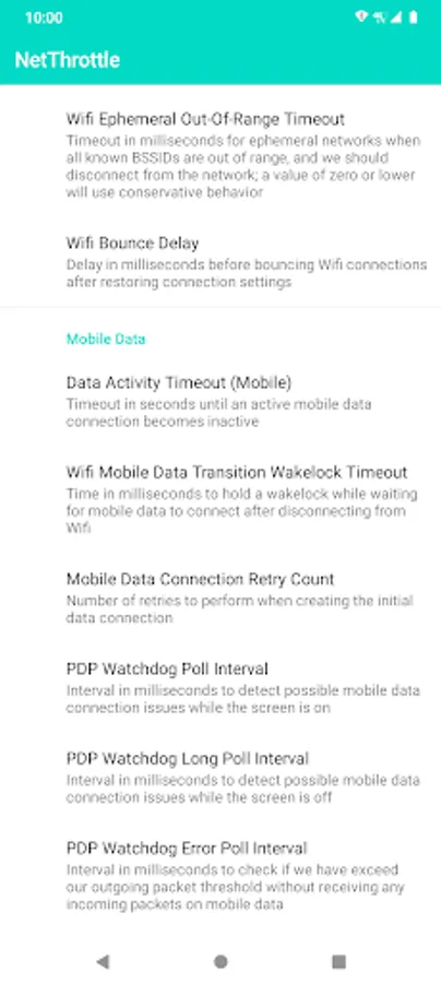 If you are familiar with networking on Linux and routers, you might get a kick out of NetThrottle. Configure everything under the sun, from Wifi Supplicant Scan Intervals, watchdog timeouts and retry counts, NetStats and quota controls, TCP window sizes, and even location throttle intervals.