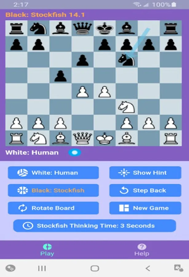 - Offline, you can set both players to be "Human(Me)" or "Stockfish" during game.