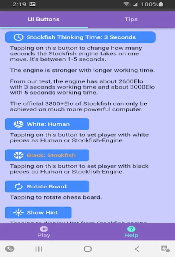 - Offline, you can set the time (1-5 seconds) the Stockfish uses in one move.
