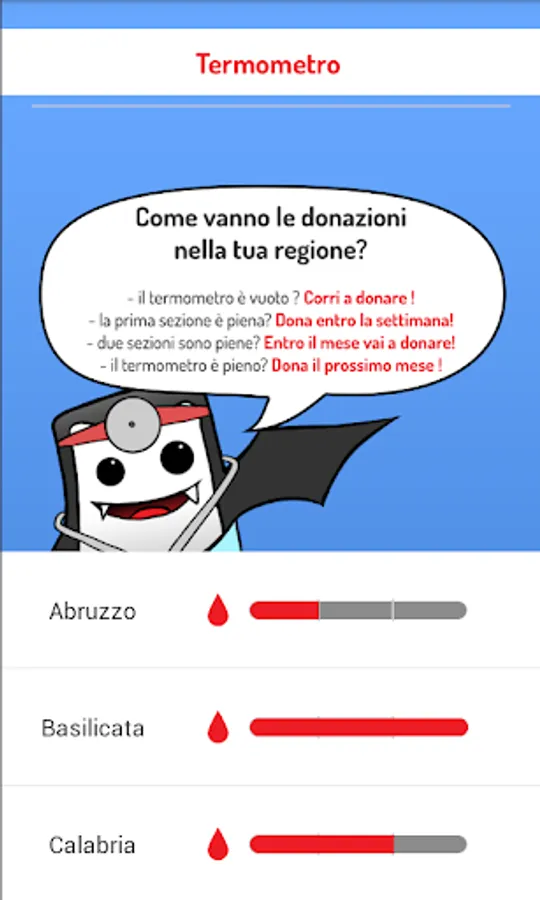 Nice and colorful app that will guide you in the world of the donation, with a little vampire ready to instruct you on the best practices of the donor, to keep healthy.
