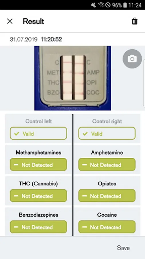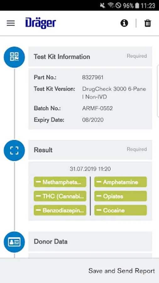 When logging each test, you can record not only the graphically displayed evaluation, but also many other details in the app. For example, you can record the identity of the user and test subject, the date, time, location and data about the test kit being used such as its production date, shelf life and batch number.