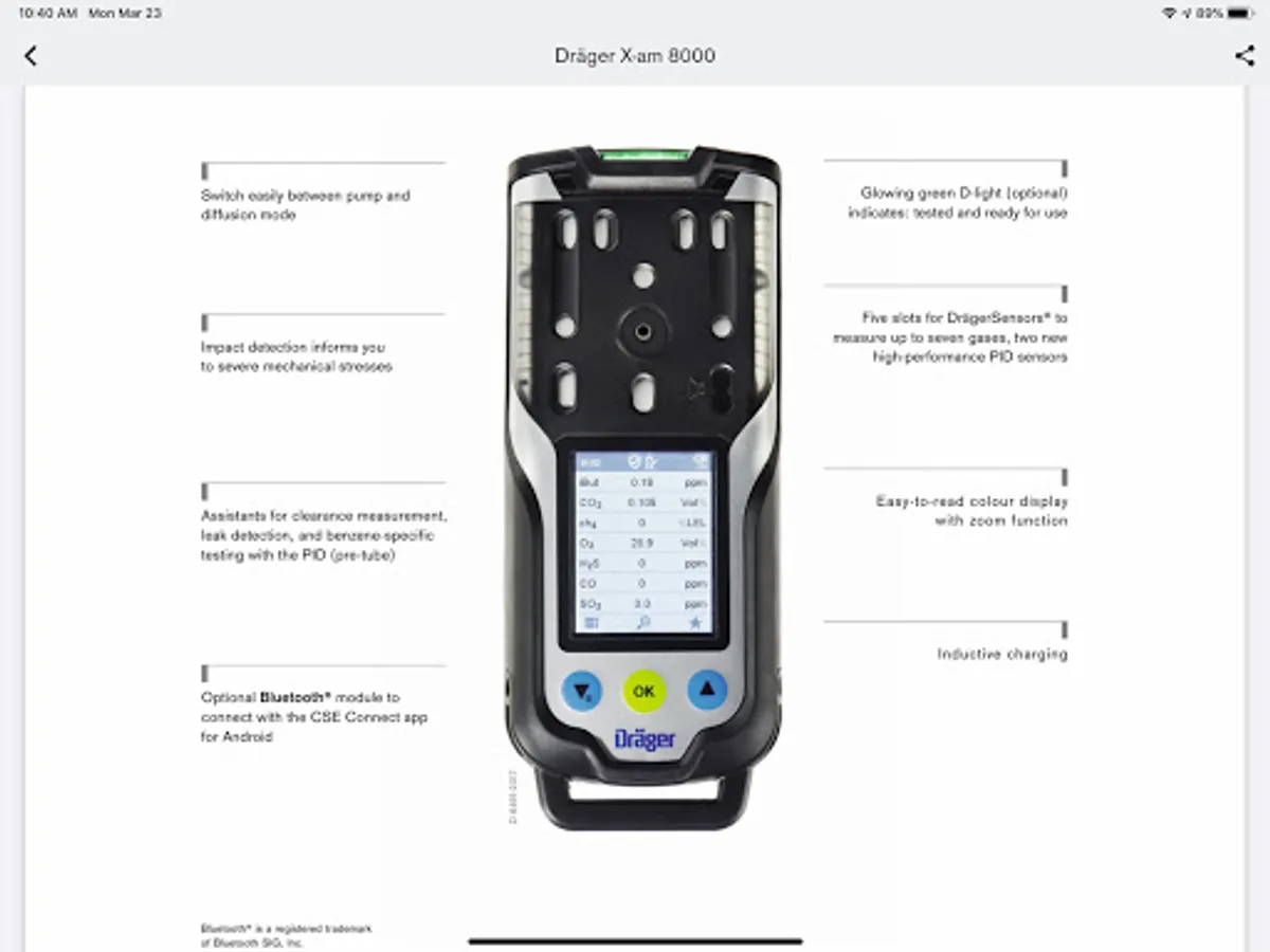 The Dräger Gas Detection App provides a general overview of gas and vapor measurement technology. The basic principles of the Dräger-Tube, Dräger Sensor and Dräger Chip Measurement System are described and a complete listing of the Dräger-Tubes and chips are provided with all relevant measurement parameters. In addition, there is an introduction to portable monitors, including electrochemical, catalytic, and infrared sensor technology, as well as a complete list of Dräger sensors and monitors. The support section contains a sensor compatibility chart, how-to videos, error code charts and links to our new customer support pages.