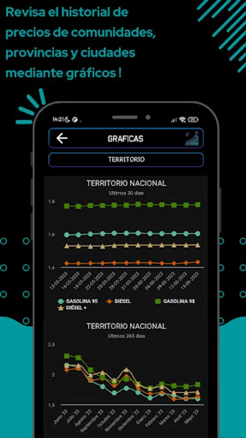 - Historical graphs: Access detailed graphs that show the average fuel prices throughout Spain, autonomous communities, provinces, cities and towns. Get valuable information on price trends over the past 30 days and a full year.