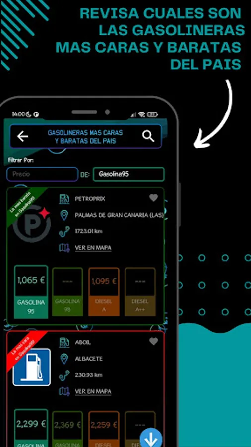 - Compare prices: Quickly find out which is the most expensive and the cheapest gas station in all of Spain for the different types of fuels, including gasoline 95, gasoline 98, diesel and diesel+. Save money by making informed decisions about where to refuel.