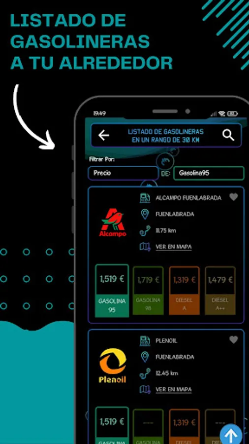 Discover the gas stations near you with GasolAPP! Our application provides you with a complete experience to find the best gas stations in a range of 1 to 100 km around you.