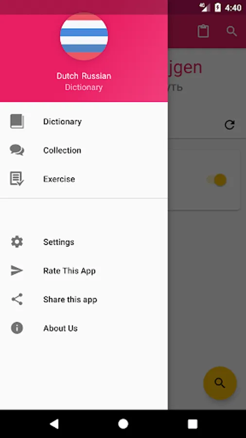 The free offline Russisch Nederlands Woordenboek & Vertaler application. Internet connection is not required! If you want to learn Russian or Dutch the most effective way, there's no better choice than Dragoma! Dragoma shows the definition/meaning of Russian or Dutch words as pop up without opening dictionary app ever. No hassle of switching between apps. You can look up word definitions while reading PDFs/e-books while browsing the internet and even while playing games. Just copy the word, Dragoma dictionary will show you the meaning/translation.