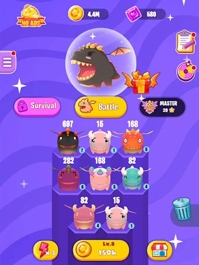 In this mergical game you need to match dragons and breed the cutest and most powerful creatures you’ve ever seen! You can grow up dragon from an egg! Develop your dragon nest to hold more little monsters and even earn rewards offline! The more high-level dragons you have, the more dragon coins they farm for you. Make your own dragon school and train them all!