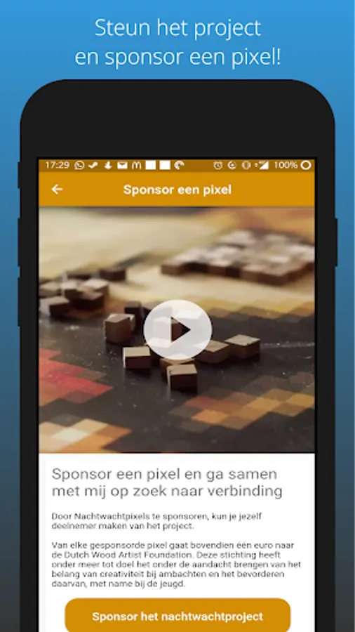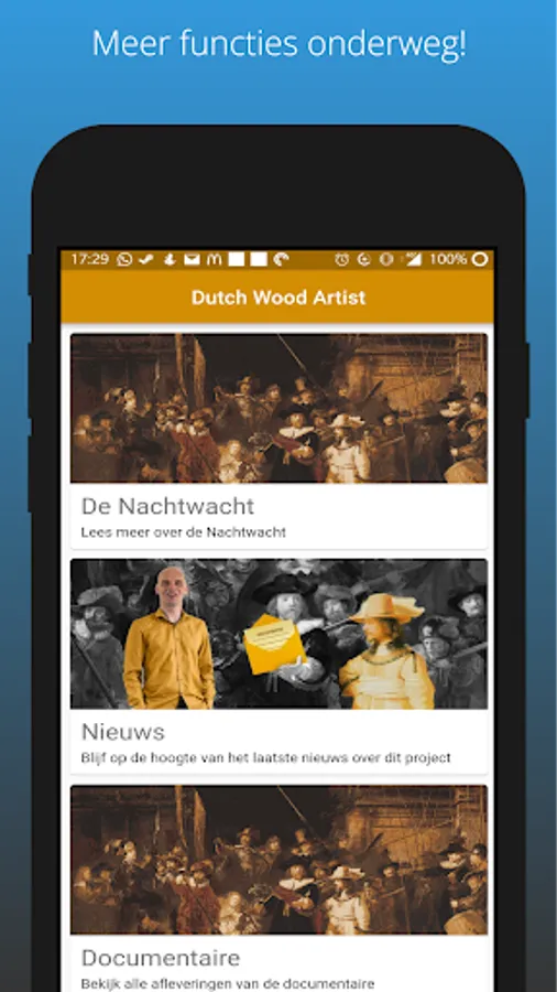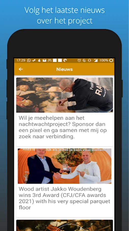 An educational app for Jakko Woudenberg's project - The Night Watch in Wood. Read all the news about the ambitious project, watch the documentaries or sponsor a pixel! The ultimate goal of the app is for visitors to interact with the Night Watch in Wood.