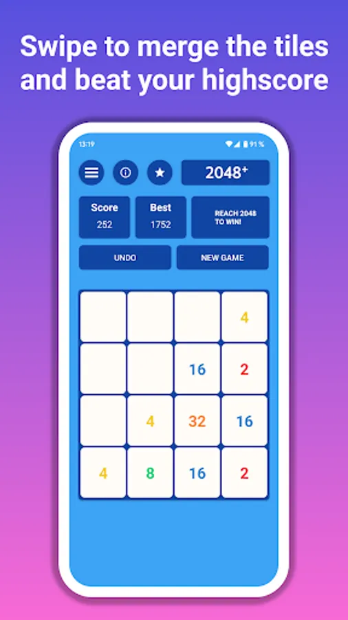 Swipe to move the tiles. When two tiles with the same number touch, they merge into one tile and double the value. Achieve a certain number of points to win the game and beat your High-Score!