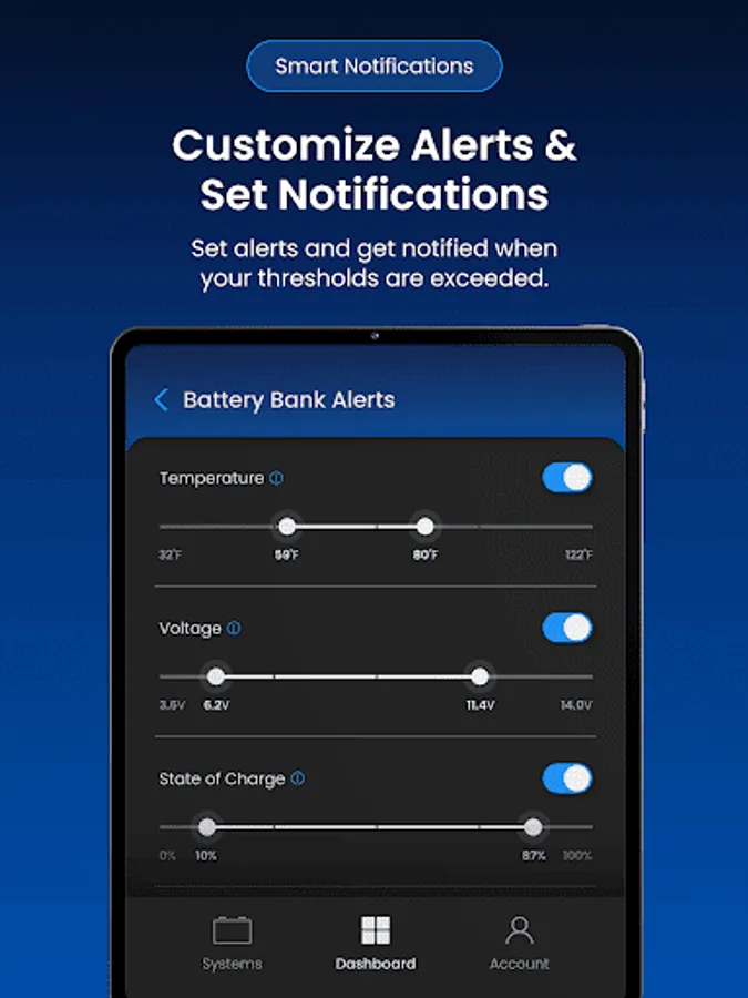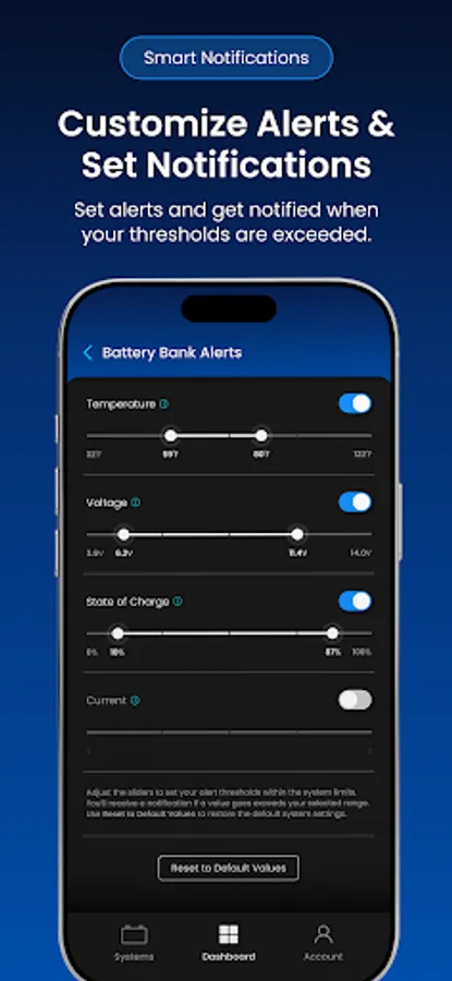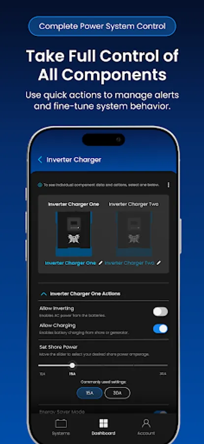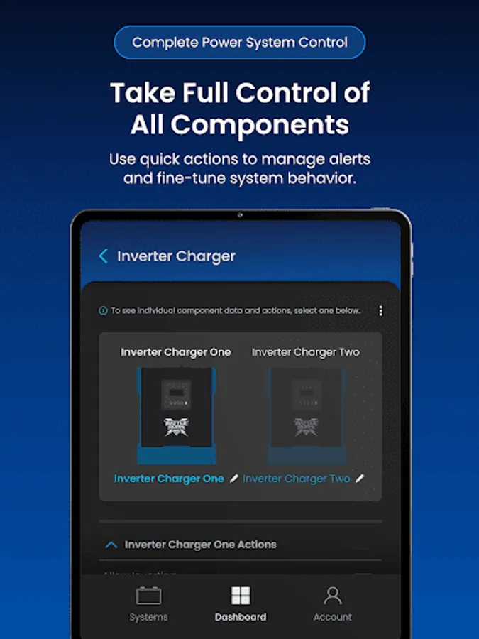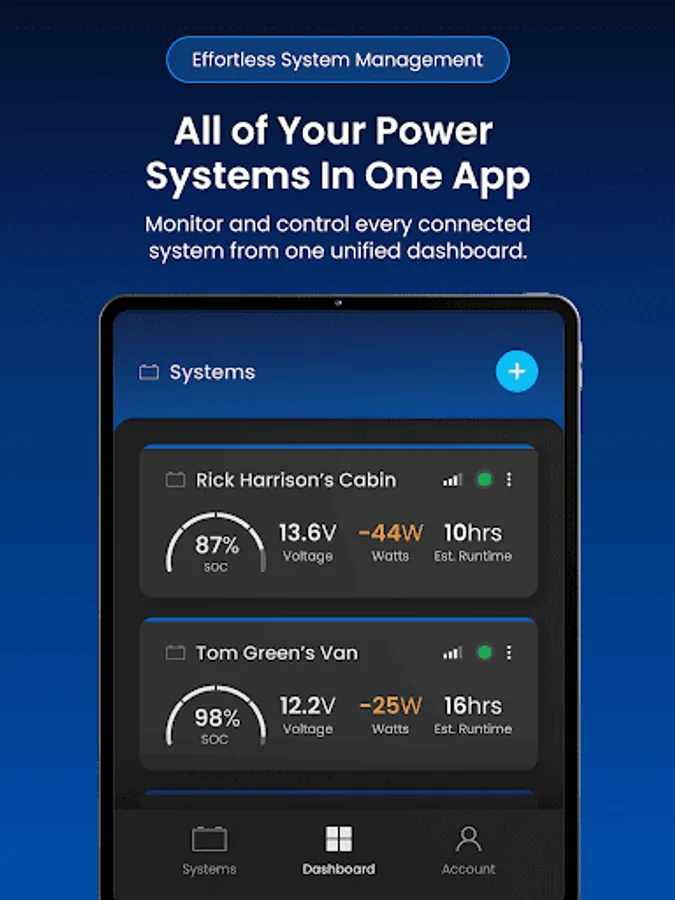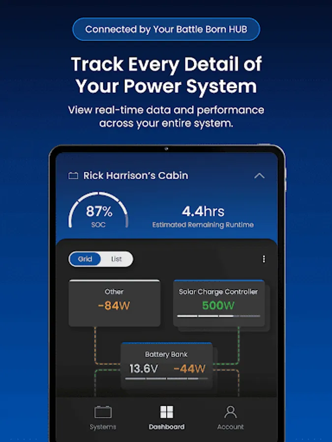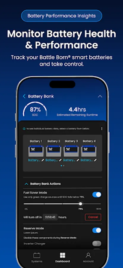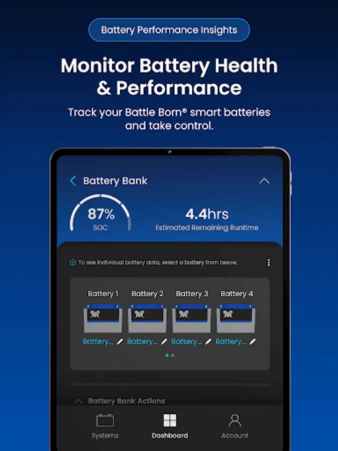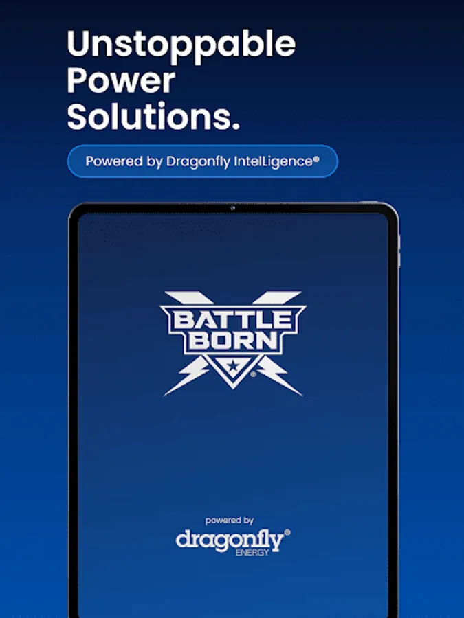 The Battle Born Mobile App provides remote monitoring, configuration, and optimization of Battle Born smart power systems equipped with Dragonfly IntelLigence technology. Version 2.0 adds a modern interface, improved performance, and broader integration across Battle Born and Wakespeed components within the system.