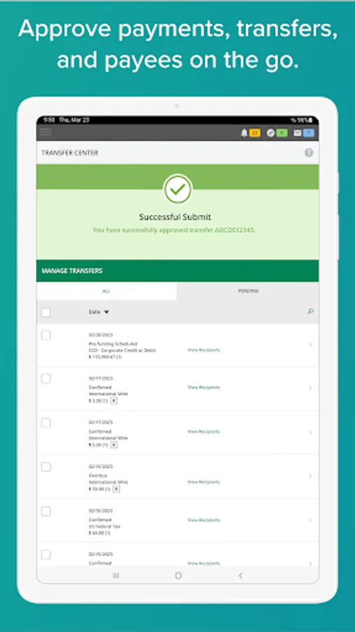 • Approve Wire Transfers and Automated Clearing House (ACH) payments.