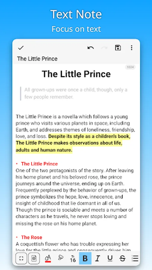• Text Note focus on text. Support rich text settings, such as color, thickness, size and margin, etc.