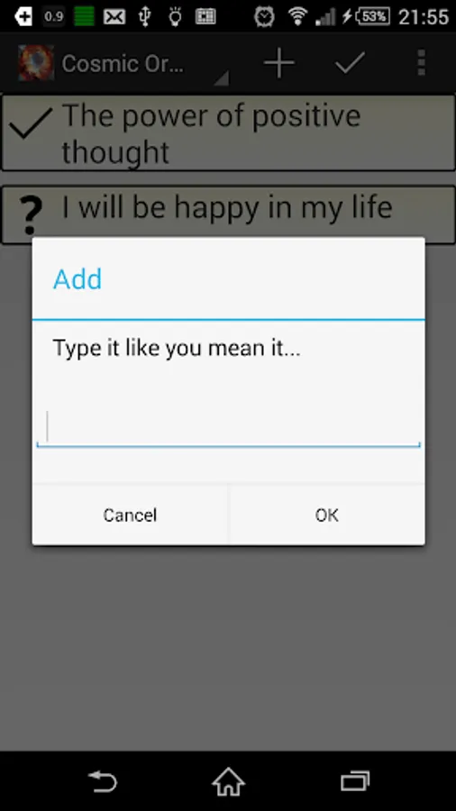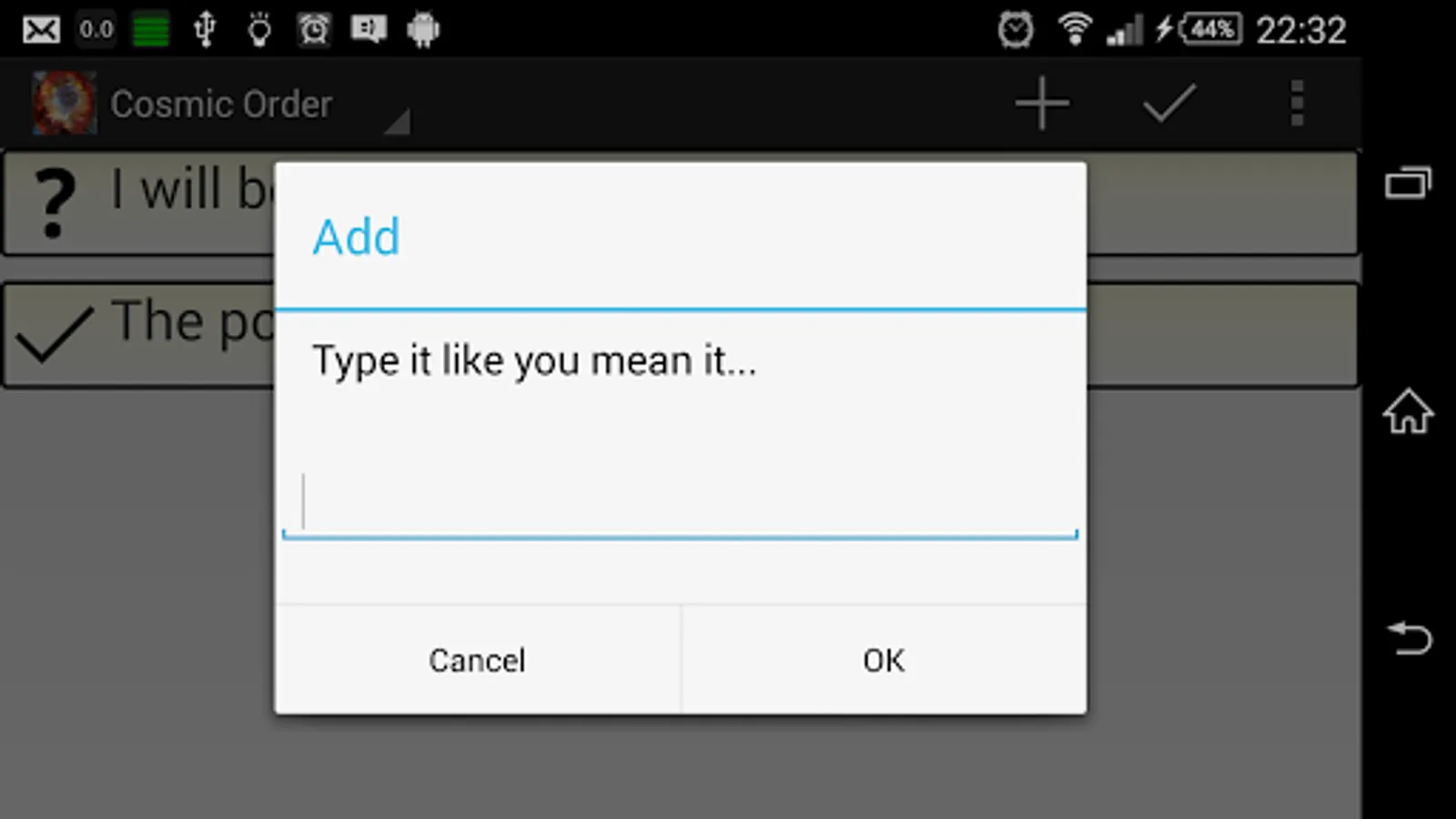 This app provides a way of recording your 'orders' so that you have a permanent record. You can mark off the ones that have been completed so you have a direct measure of how positive your thoughts are!