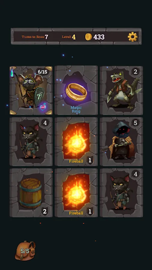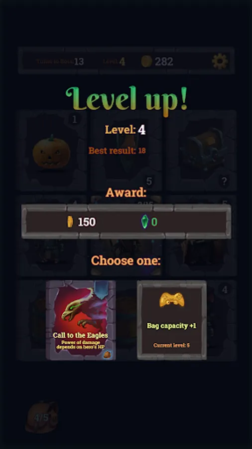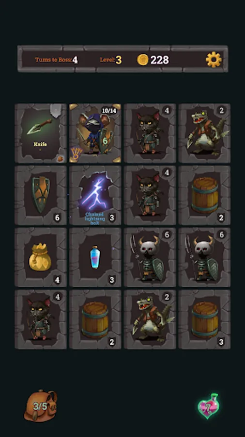 Defeat a boss and add difficulty to the game and upgrade the hero. Get a chest as a reward. Take care: among useful cards one can meet dangerous ones, like poison, for example.