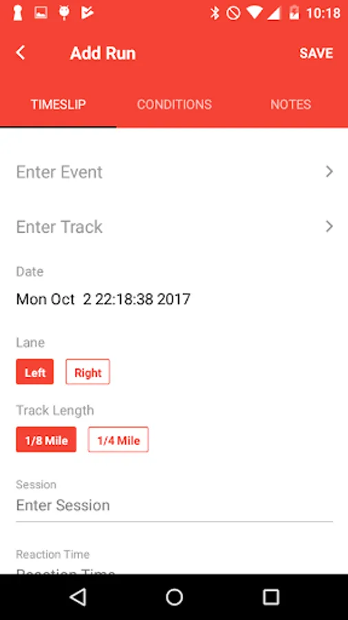The DragTuner run logger is the core of the mobile app. It allows users to log their timeslip, conditions, and other various information. Choose a track from one of the many pre-loaded tracks in the United States or add your own. DragTuner allows you to add the event as well which will be saved for later runs. Choose between ¼ mile and ⅛ mile and enter your timeslip.
