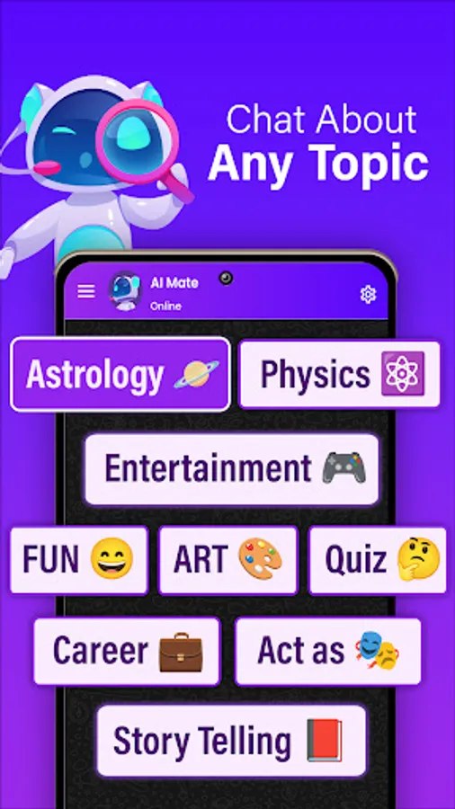 Welcome to AI Mate, the ultimate AI-powered chatbot app that can help you with anything and everything! Whether you're looking for personalized recommendations, answers to your questions, or just a friendly chat, AI Mate is here to make your life easier and more enjoyable.